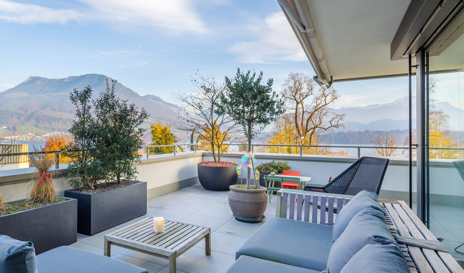 Ein besonderes Highlight ist die Panoramaterrasse mit einer weitläufigen Fläche von 60 m². Der weitläufige Aussenbereich ist ideal für sonnige Stunden mit traumhaftem Blick und purer Entspannung.
