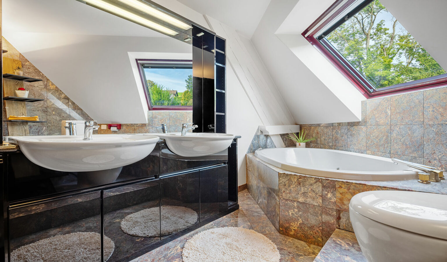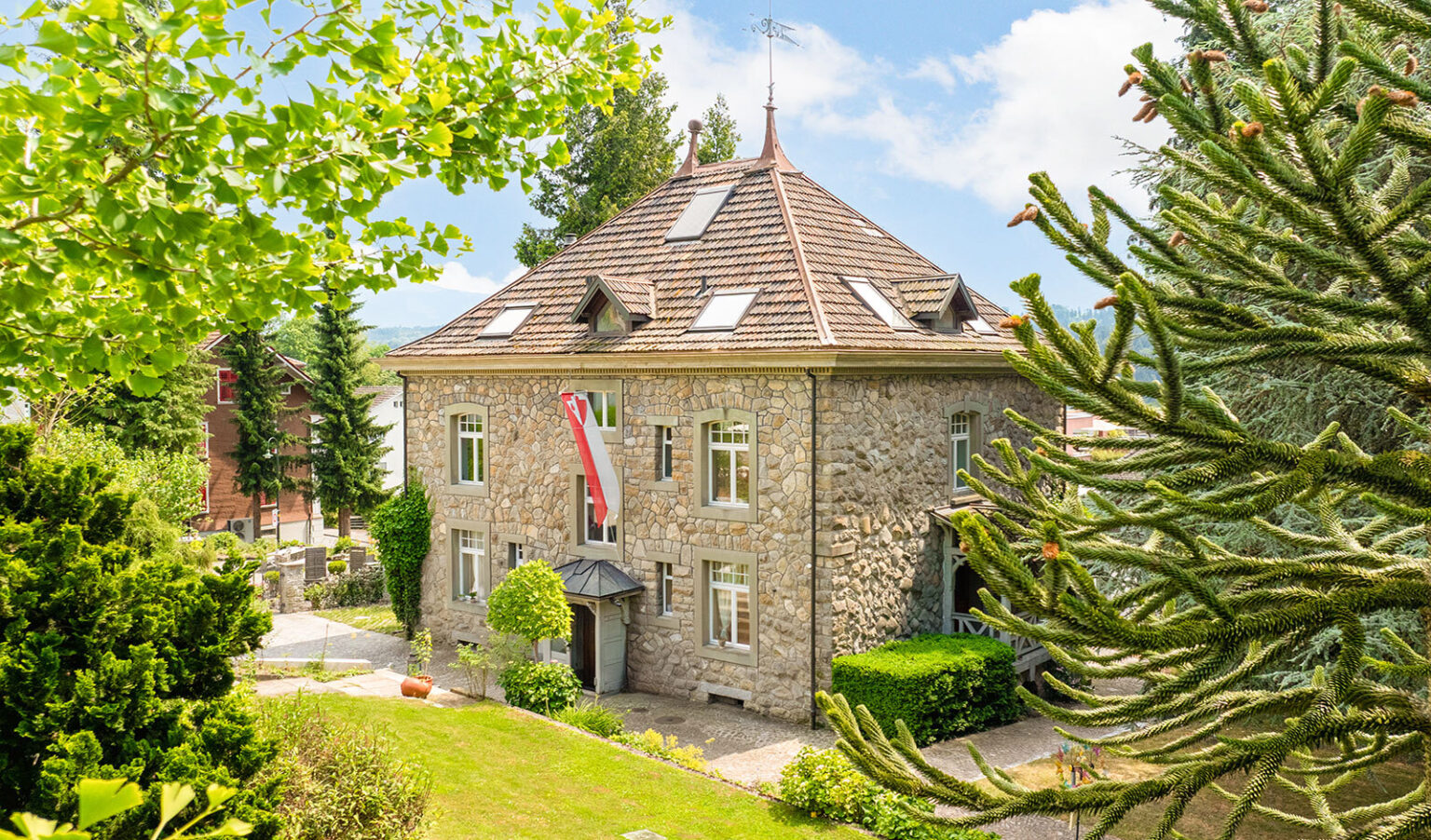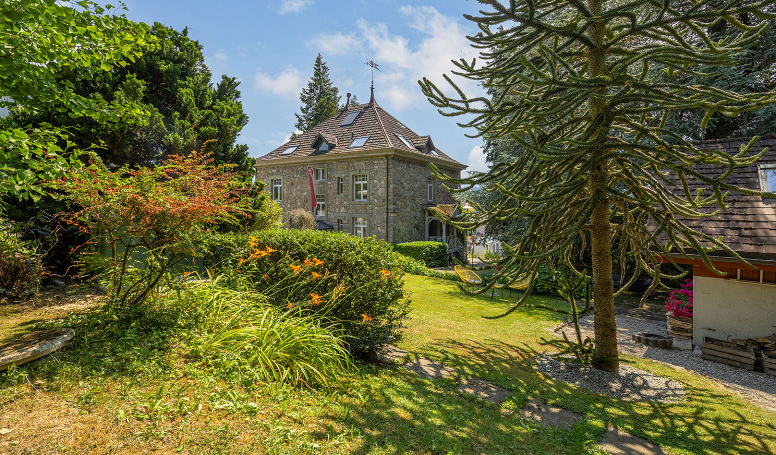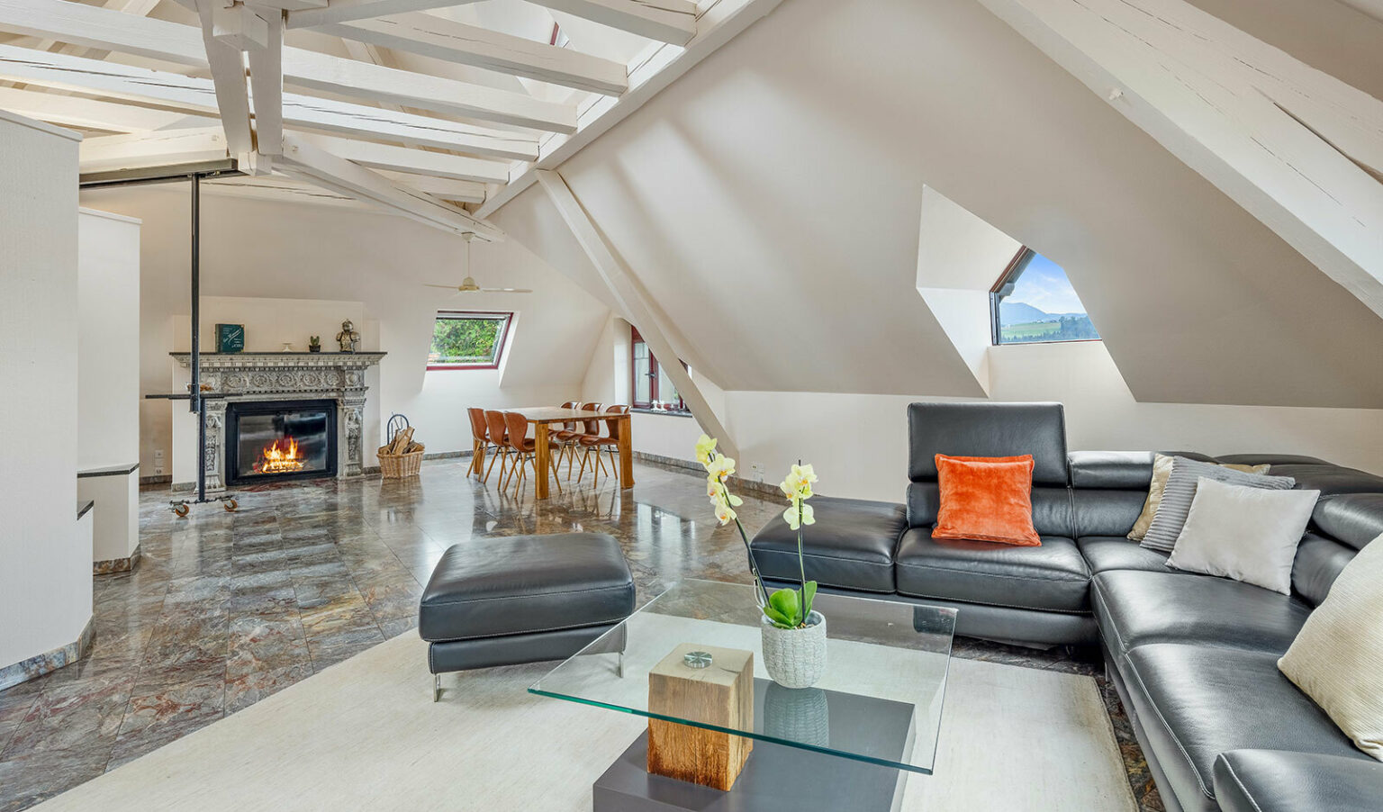 An open-plan, spacious living area of over 75 metres awaits you on the top floor of the villa2. The airy height of the room and the numerous windows create a relaxed atmosphere. The room's eye-catching feature is the beautiful neo-Renaissance fireplace with ornate sandstone panelling - this showpiece was originally part of the furnishings of the Grand Hotel National in Lucerne. On this floor, owners will also find a fully equipped kitchen and a bathroom with bath and shower.