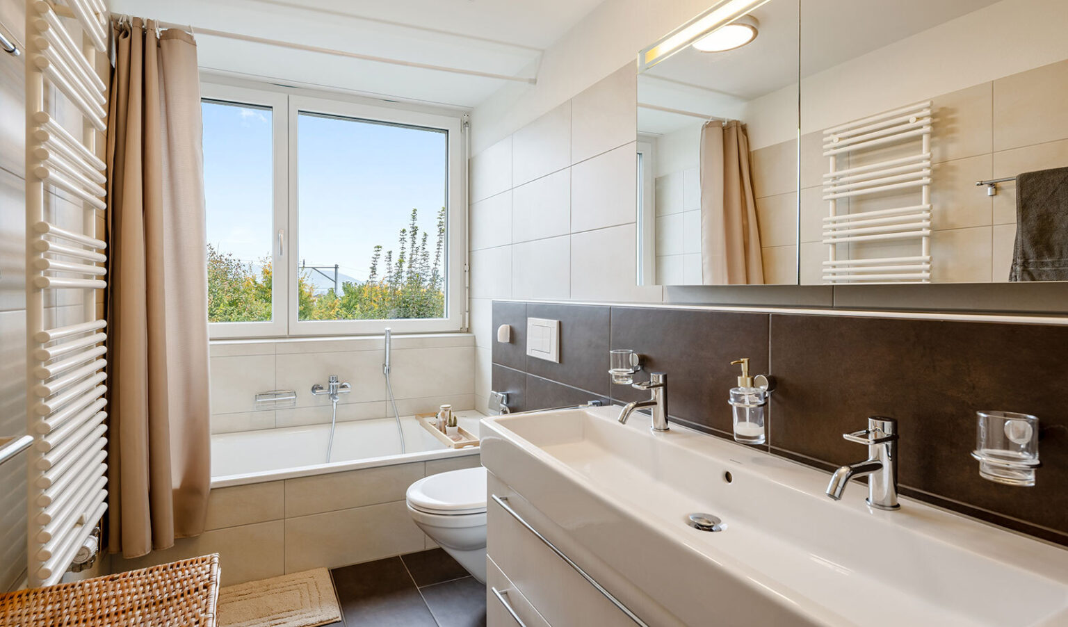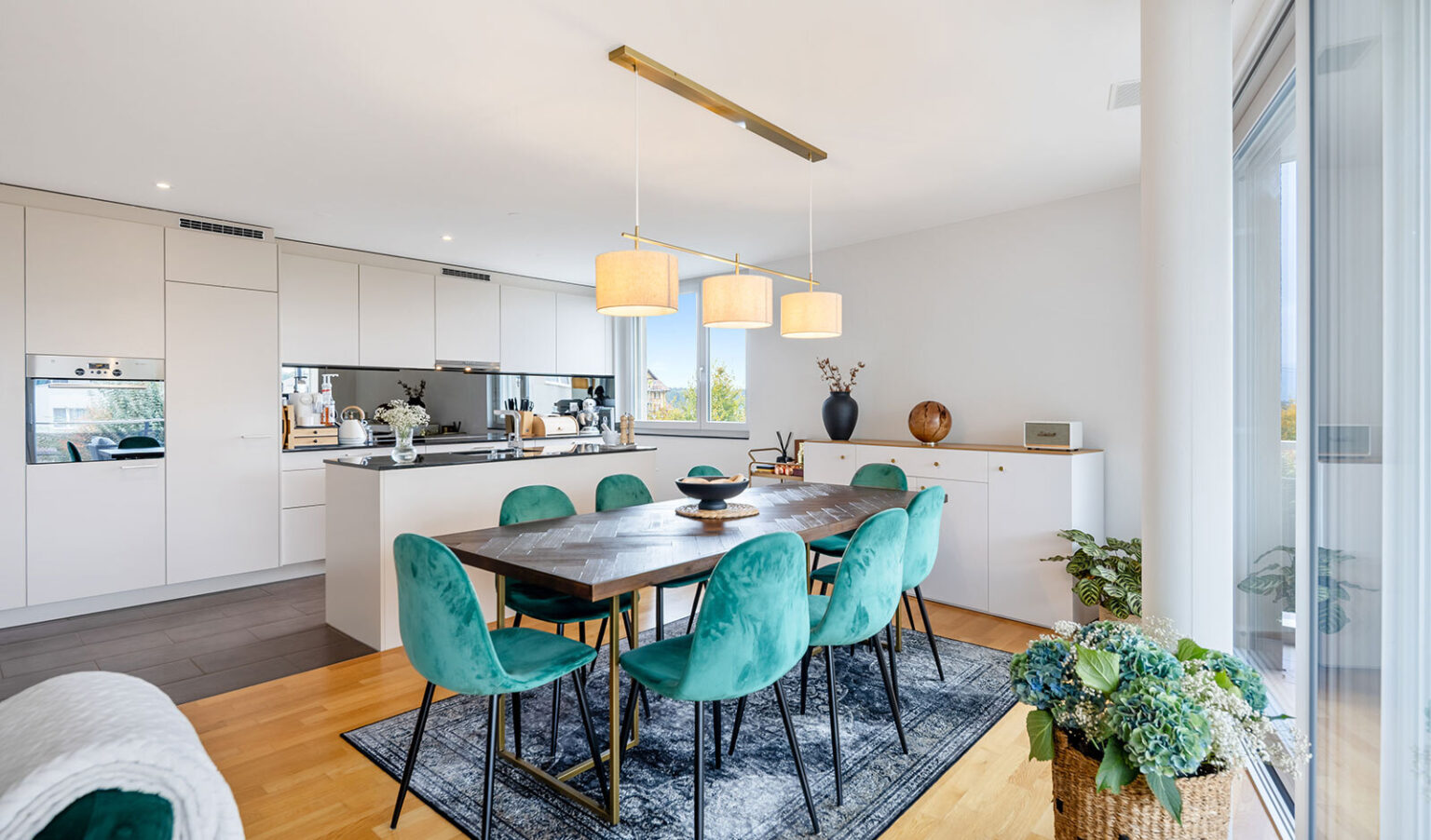 The 4½-room flat with a living space of 100 m² is located in a modern property built in 2012 and is currently let to a young family. The interior is characterised by high-quality materials and contemporary design: