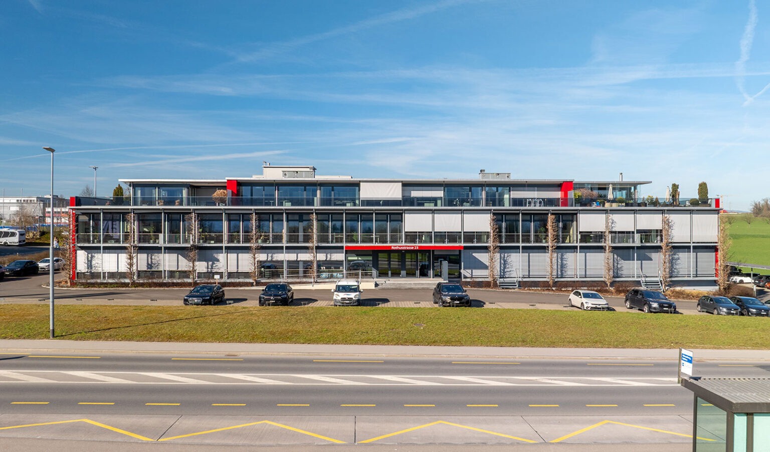 The rental offer includes four parking spaces (outdoor, covered and underground) and 19 visitor parking spaces. The location in the low-tax canton of Zug, not far from Lake Zug, emphasises the quality of this location for companies with high demands on accessibility and infrastructure.