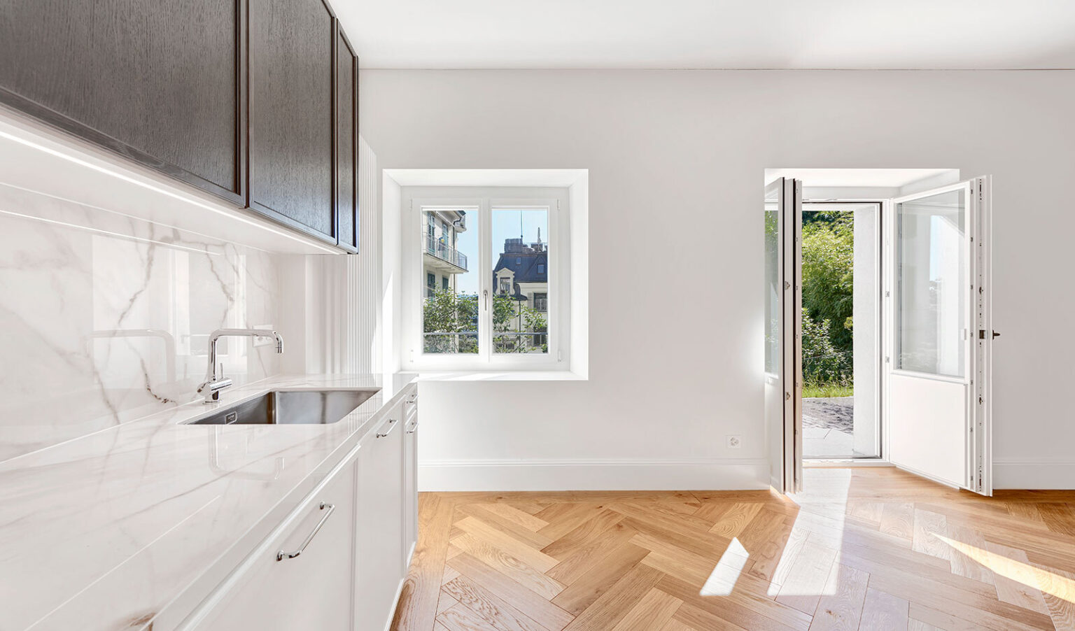 The villa has been completely refurbished with great attention to detail and now shines in breathtaking splendour: high-quality, elegant materials meet state-of-the-art technology and ensure the highest level of living comfort. All flats have been completely refurbished and have direct lift access via the newly built car park.