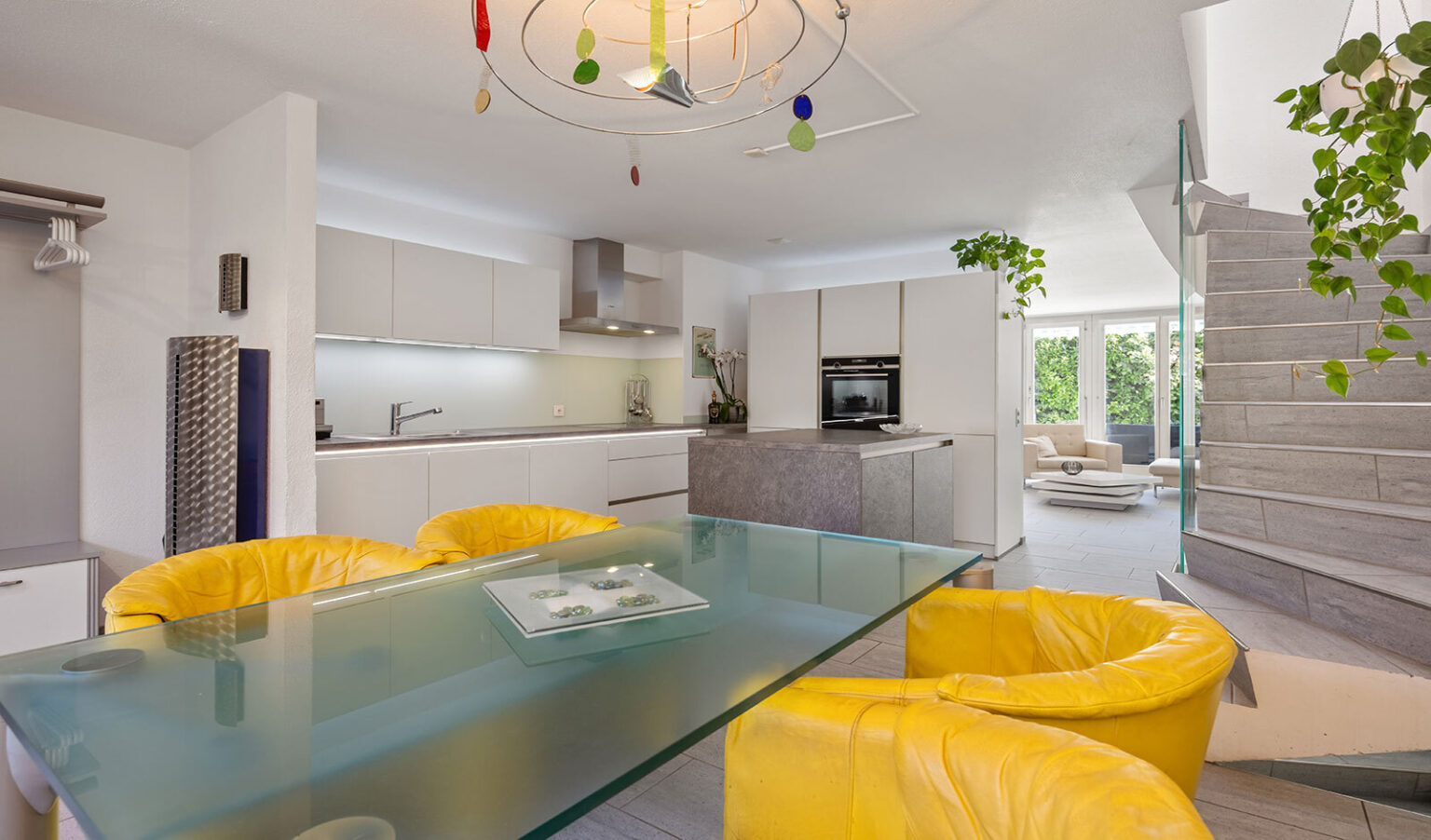 The living floor impresses with its compact layout of living and dining area. The kitchen was renovated in 2021 and equipped with a practical cooking island.