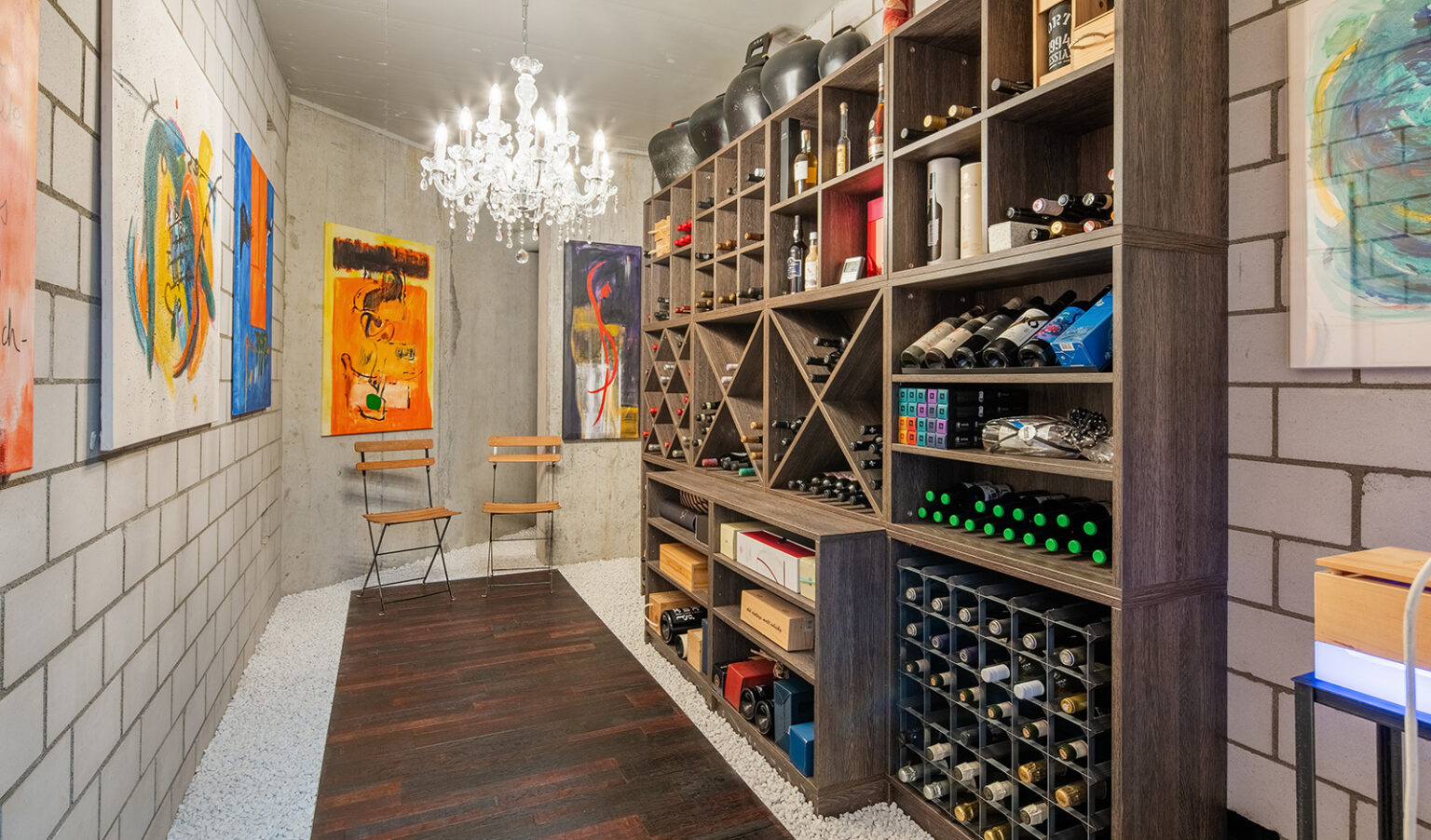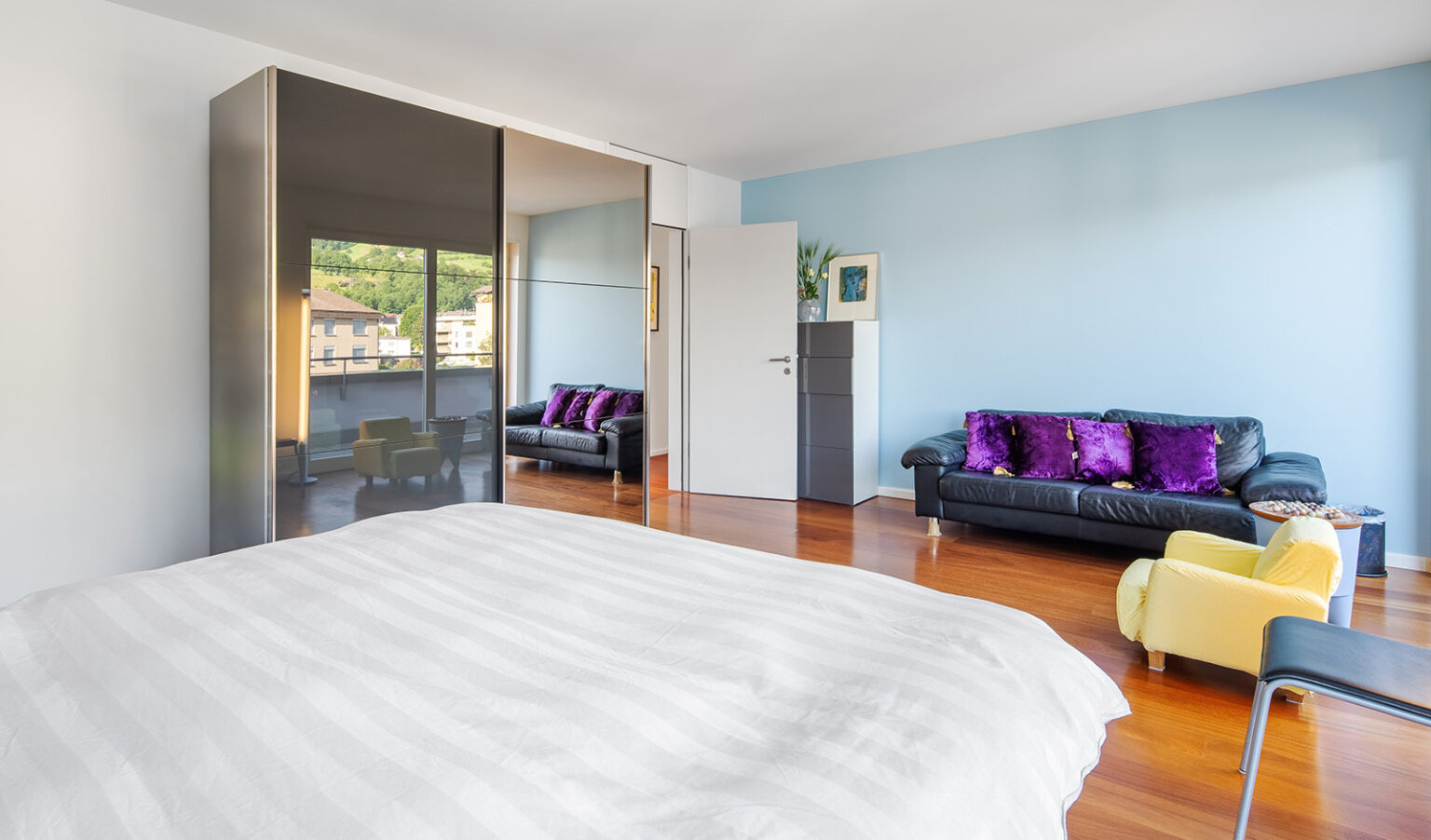 Das Raumkonzept ist einfach und äusserst praktisch: Die gesamte Wohnung erstreckt sich auf einer Ebene mit drei Schlafzimmern, die alle einen direkten Zugang zur Terrasse haben. Jede der Nasszellen ist mit Fenstern ausgestattet. Für diejenigen, die gerne von zu Hause aus arbeiten, bietet ein dafür perfekt geeignetes Bürozimmer die ideale Arbeitsumgebung. Mit dem Lift gelangen Sie zum stilvoll ausgebauten Weinkeller, hier sind edle Weine gut aufgehoben.