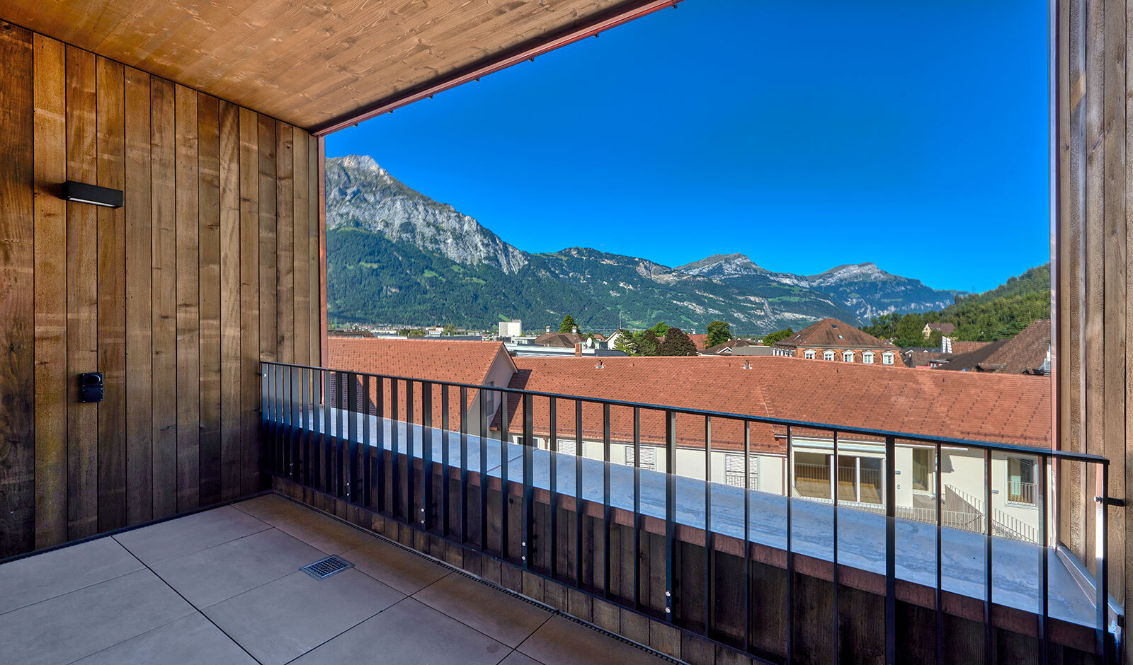 Hohe Räume und hell lasiertes Holz schaffen ein warmes, modernes Wohngefühl mit dem besonderen Charme einer Dachwohnung. Extravagante Lukarnen sorgen für viel Tageslicht und eine einzigartige Stimmung in allen Räumen. Von der Loggia aus geniessen Sie Ihre Privatsphäre und einen traumhaften Blick in die Berge.