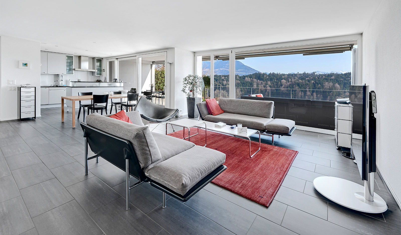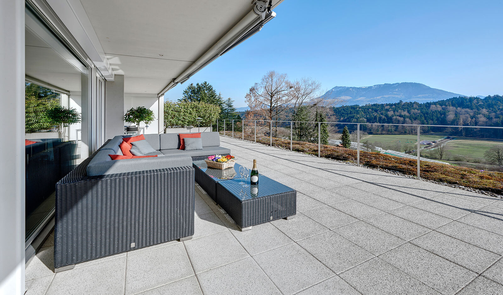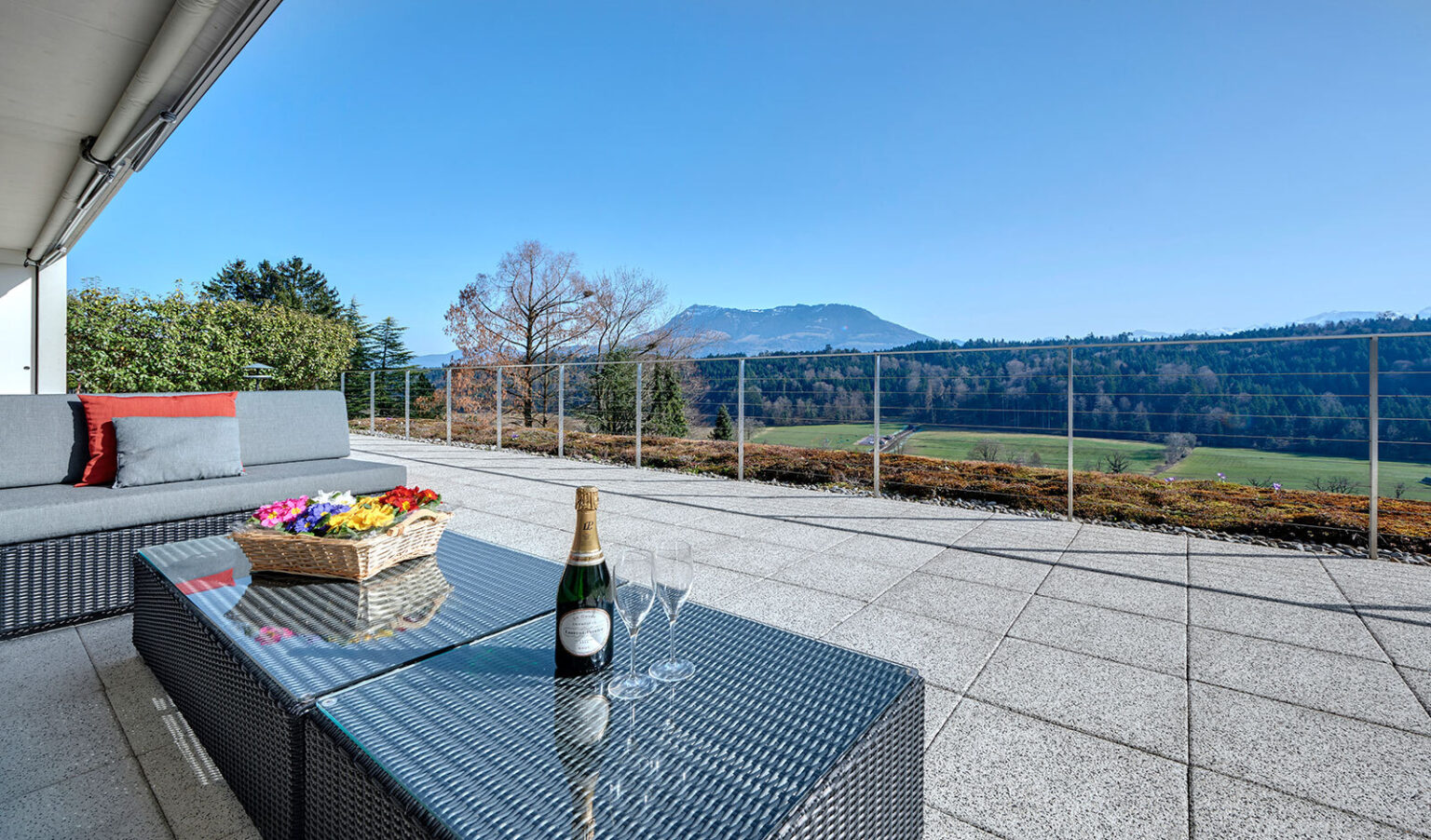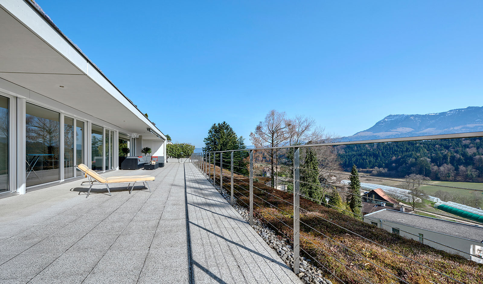 Ein besonderes Highlight ist die beeindruckende Terrasse, die von sämtlichen Zimmern direkt zugänglich ist und das Wohnen harmonisch nach draussen erweitert.