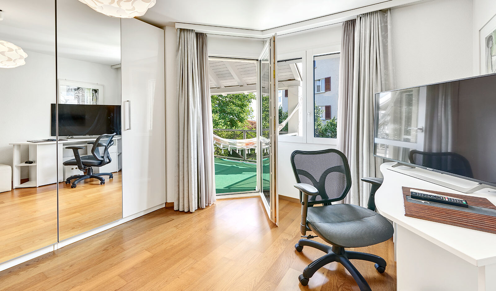 Im obersten Stockwerk finden Sie ein zusätzliches Schlafzimmer mit Zugang zu einem hellen, verglasten Balkon – perfekt für entspannte Momente im Freien. Der grosszügige Wohnbereich bietet Ihnen zudem die ideale Gelegenheit, ein eigenes Homekino einzurichten und gemütliche Filmabende zu geniessen.