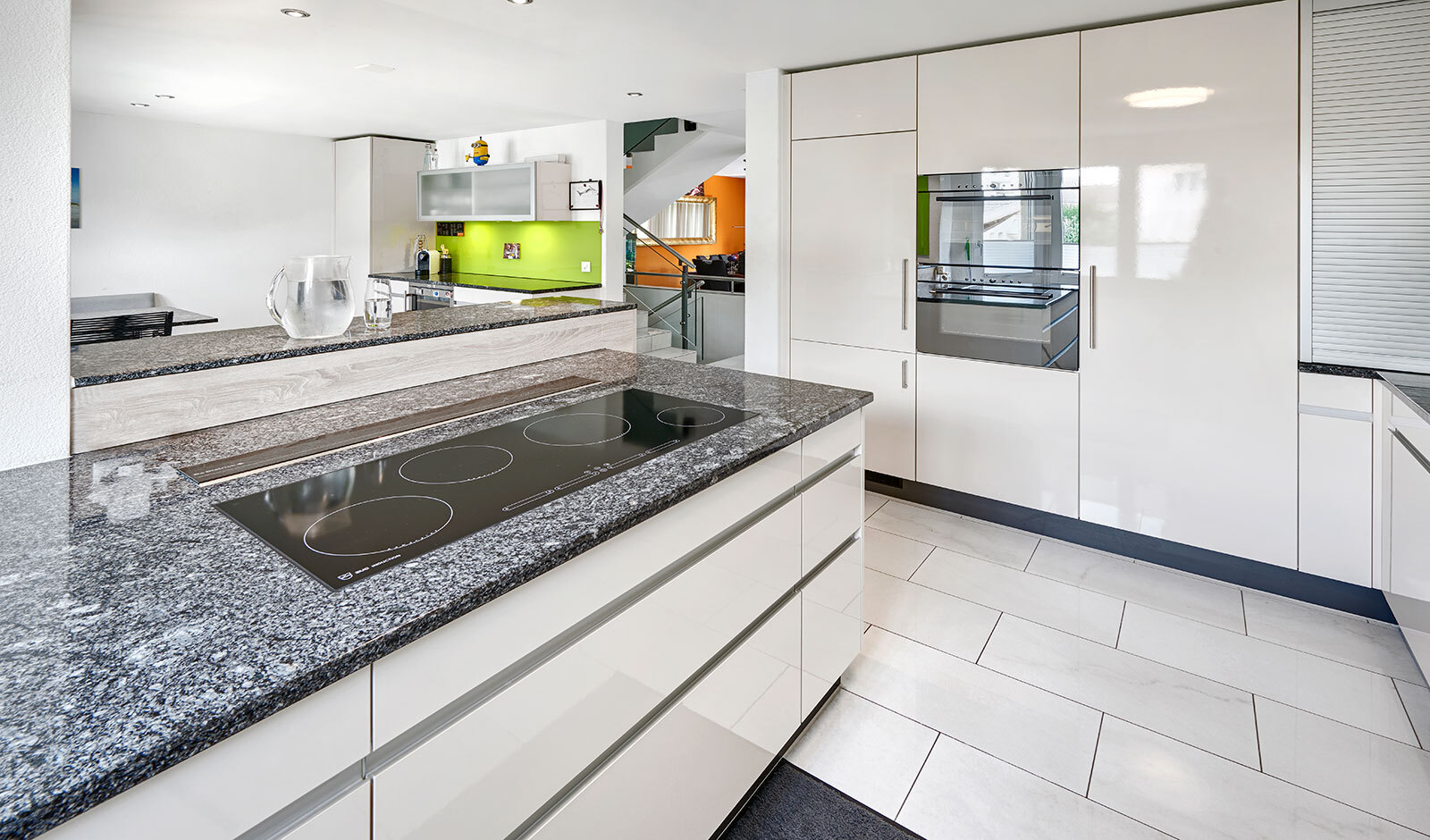 Die offene Gestaltung von Küche, Ess- und Wohnzimmer lässt keine Wünsche offen und bietet viel Stauraum und Ablageflächen. Sie kochen auf einem extrabreiten Induktionsherd mit modernem Dunstabzug. Weinliebhaber werden den Weinkühlschrank zu schätzen wissen, der mit gleichbleibender Temperatur und bestimmter Luftfeuchtigkeit ideale Lagerbedingungen garantiert.