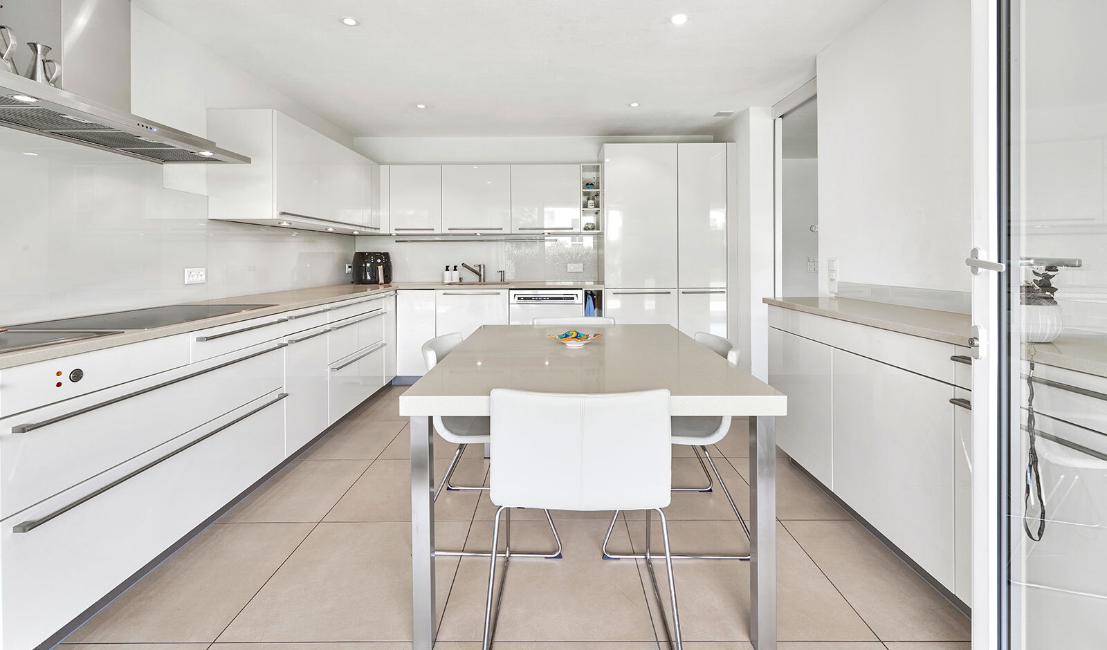 Der offen gestaltete Wohn-/Essbereich bietet viel Licht und Raum zum Leben. Grosse Fensterfronten durchfluten sämtliche Räume mit Tageslicht. Die Küche mit V-Zug Geräten sowie Teppanyaki-Feld ist in hellen, mediterranen Farben gehalten.
