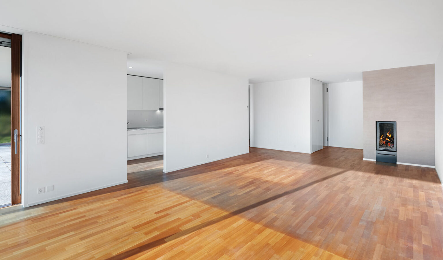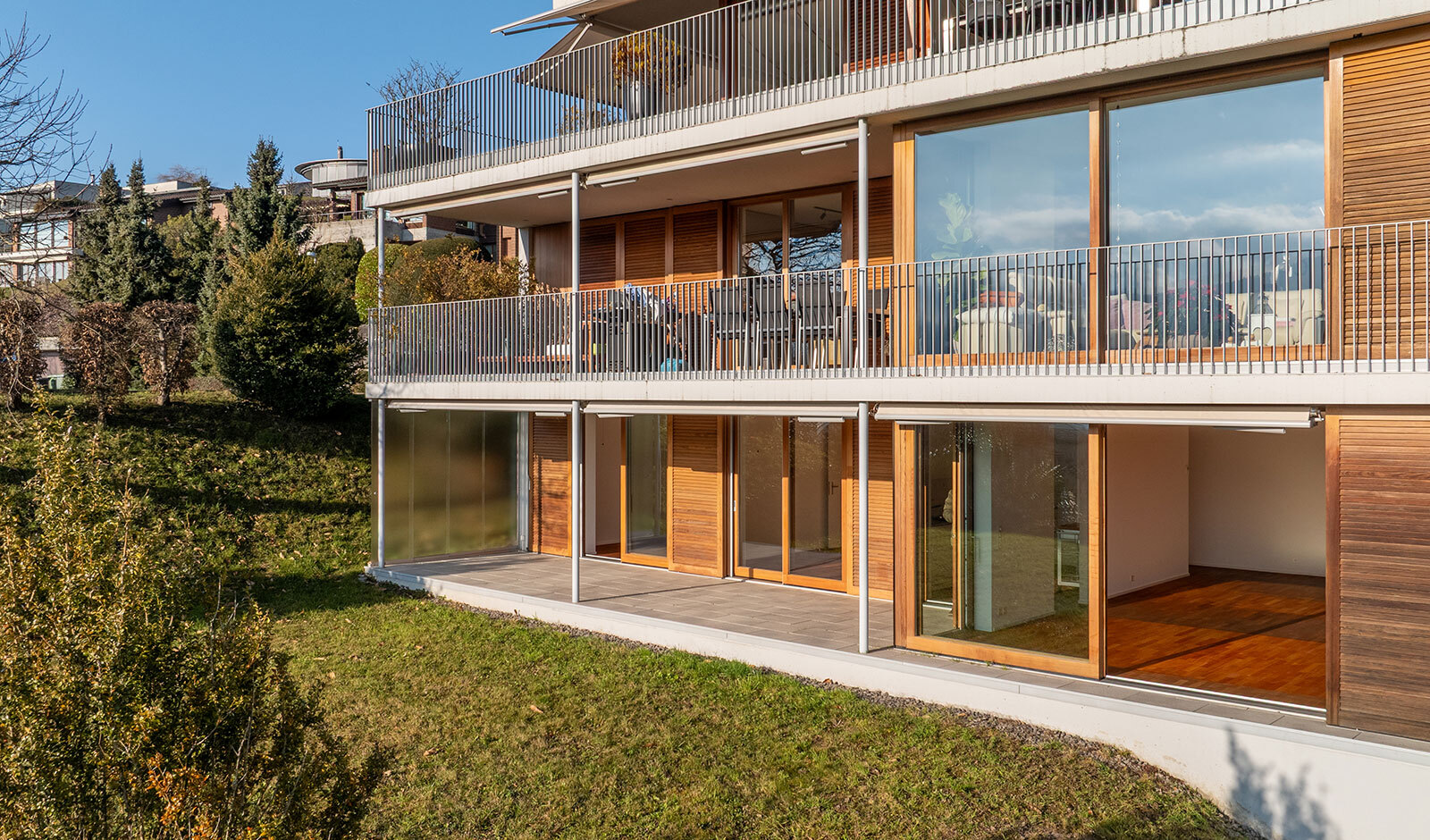 Vom Wohnbereich aus gelangen Sie auf die überdachte Terrasse mit Zugang zur grosszügigen Grünfläche. Hier geniessen Sie Ruhe, viel Sonne sowie eine herrliche Weitsicht mit alpinem Panorama – ein idealer Ort zum Entspannen und Verweilen.
