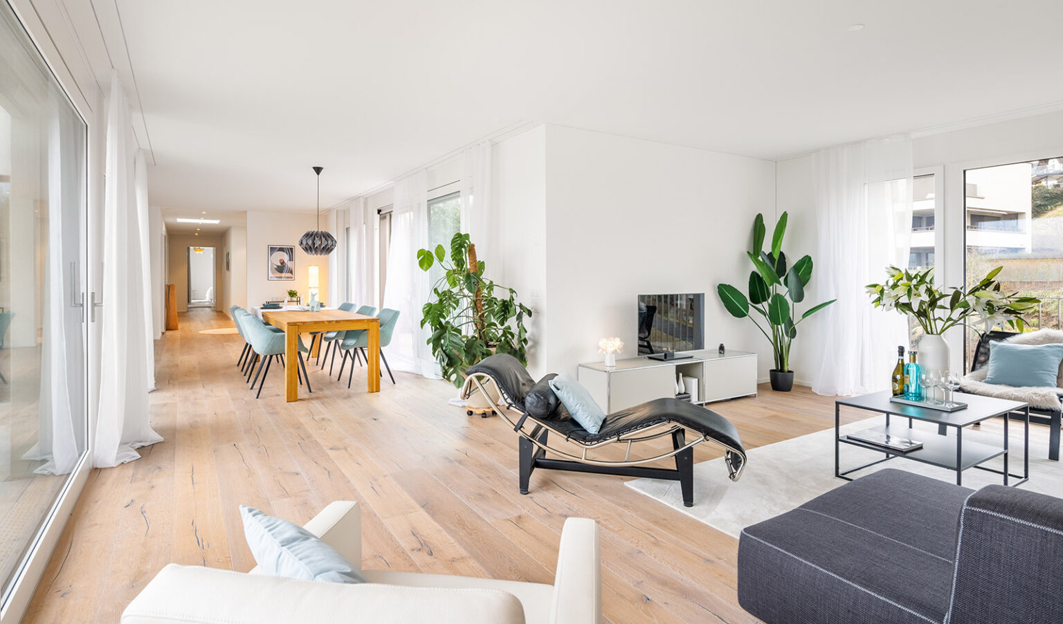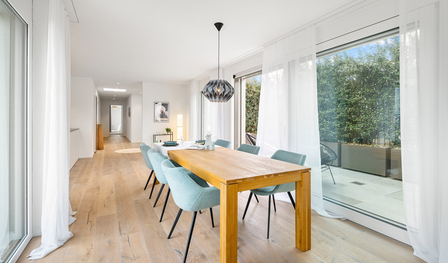 Natürliche Materialien, warme Farben und eine intensive Verbindung zwischen den Innen- und Aussenräumen gewährt ein aussergewöhnliches Wohnerlebnis. Die riesigen Aussenterrassen vergrössern visuell die Innenbereiche und gewähren jederzeit Schatten oder Sonne, ganz nach Ihrem aktuellen Bedürfnis. Das architektonische Konzept unterteilt die Bereiche Wohnen, Essen, Arbeiten und Schlafen perfekt mit einer immer präsenten Grosszügigkeit.