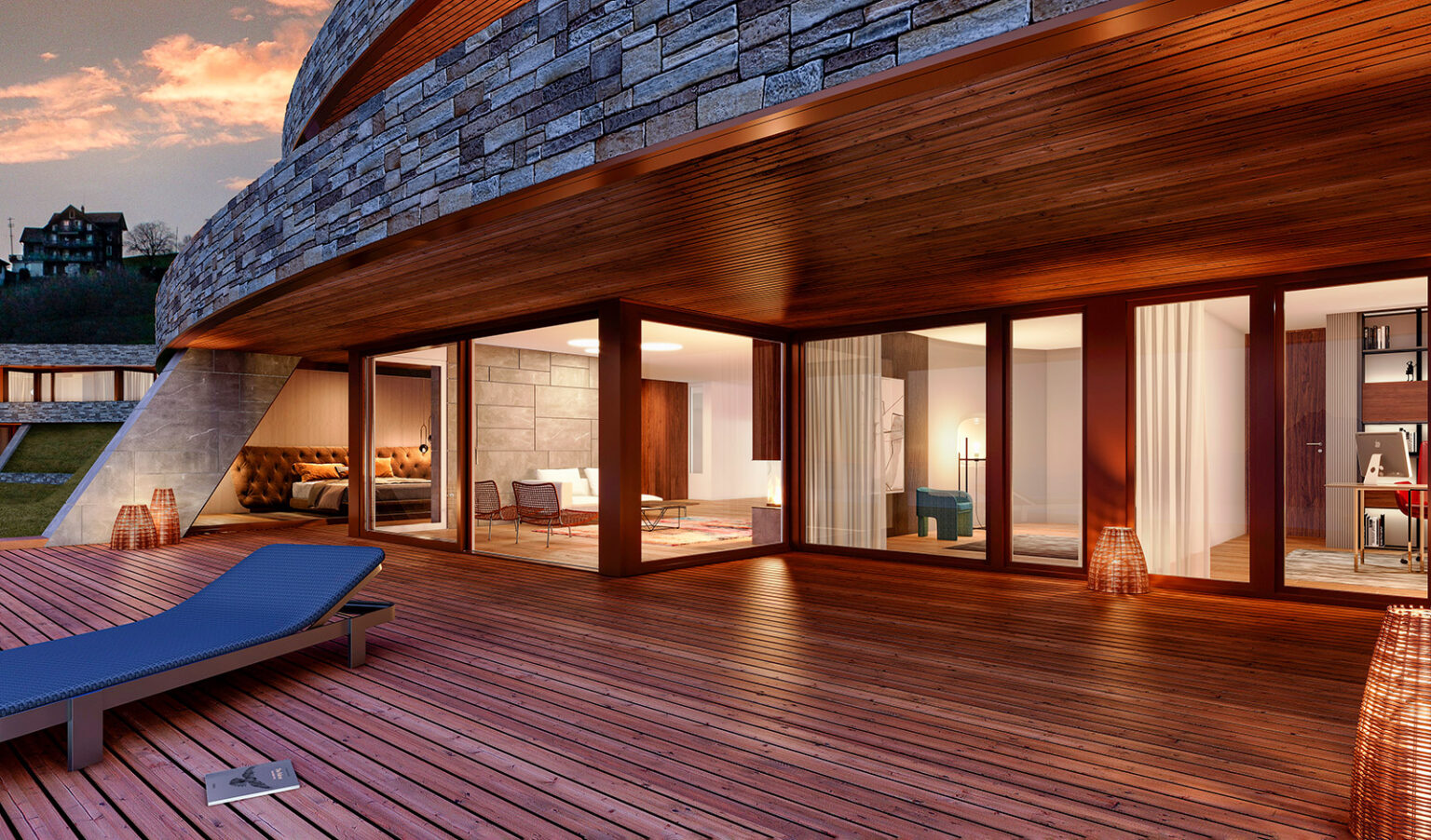 Sichtbar sind im Wesentlichen die riesigen Terrassen, die den Baukörpern vorgelagert sind. Die Wohneinheiten selbst sind in den Hang eingebettet. Naturstein, Holz und Glas bilden die Zutaten für deren Kompositionen. Modern und cool und doch nie kalt kommen die sehr grosszügigen Wohnräume und Terrassen daher.