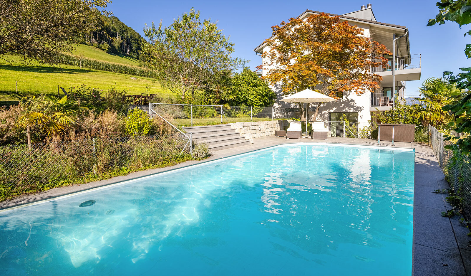 Ein besonderes Highlight ist der beheizte Aussenpool, welcher den drei Parteien zur Verfügung steht. Die naturnahe Umgebung mit Obstbäumen, Wiesen und ganztägiger Besonnung macht diese Wohnung ideal für Menschen mit hohen Ansprüchen an Wohnqualität, die Ruhe und Grosszügigkeit schätzen.