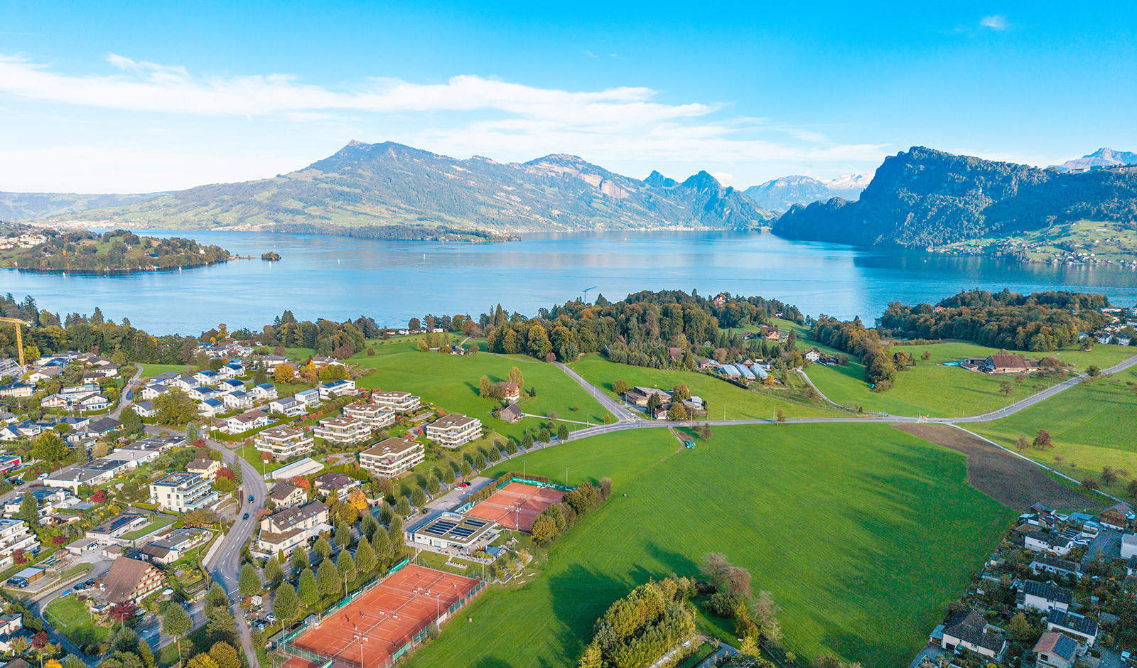 Von nahezu jedem Zimmer, des 1928 erbauten Dreifamilienhauses schweift der Blick über saftig grüne Wiesen, den glitzernden Vierwaldstättersee und die majestätische Bergkulisse. Das Anwesen befindet sich im begehrten Felmis-Quartier – einem ruhigen Ort ohne Durchgangsverkehr. Die Liegenschaft grenzt auf drei Seiten an die Landwirtschaftszone, was dem Anwesen ein Gefühl von Weite und ländlicher Noblesse verleiht.