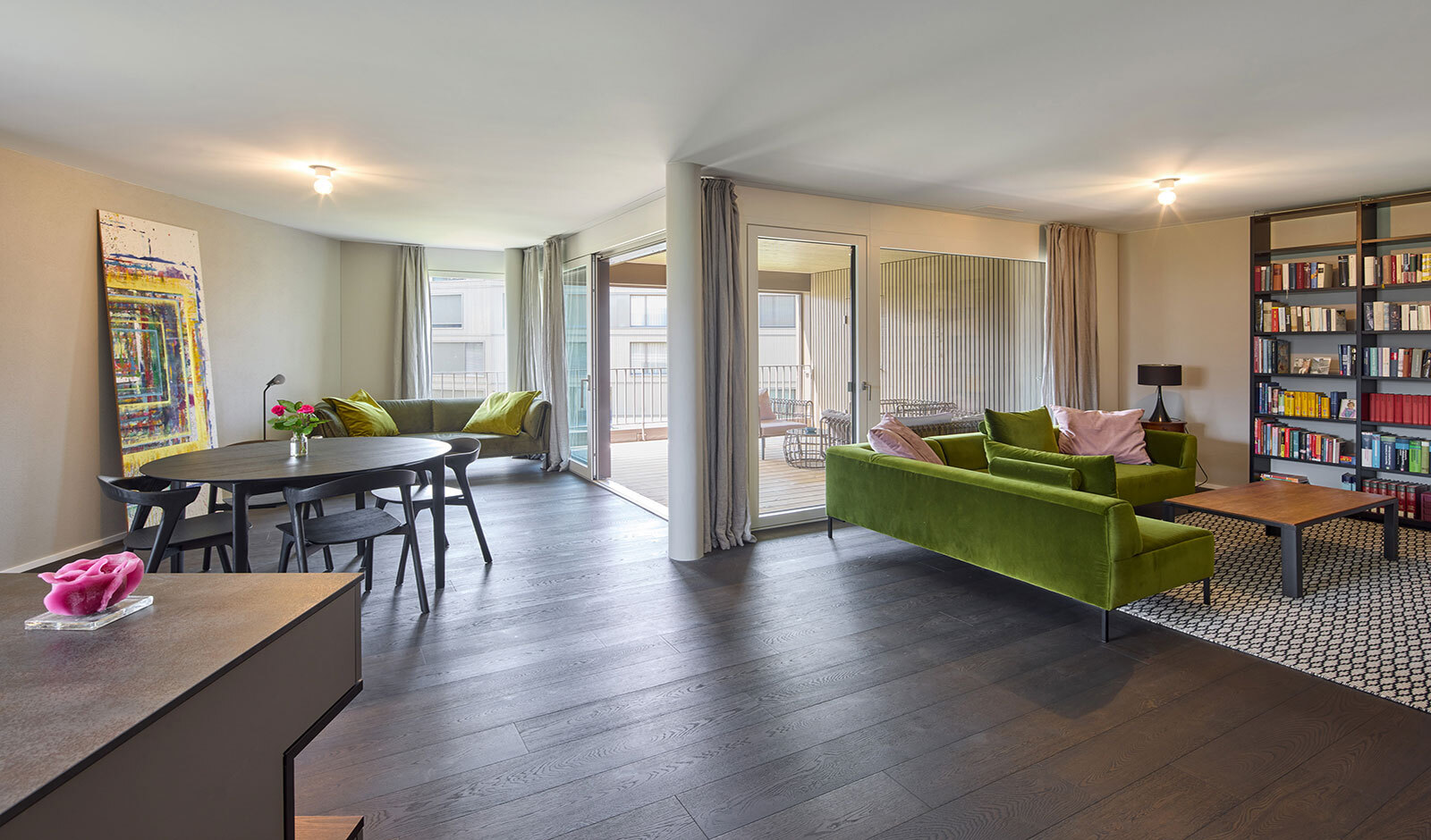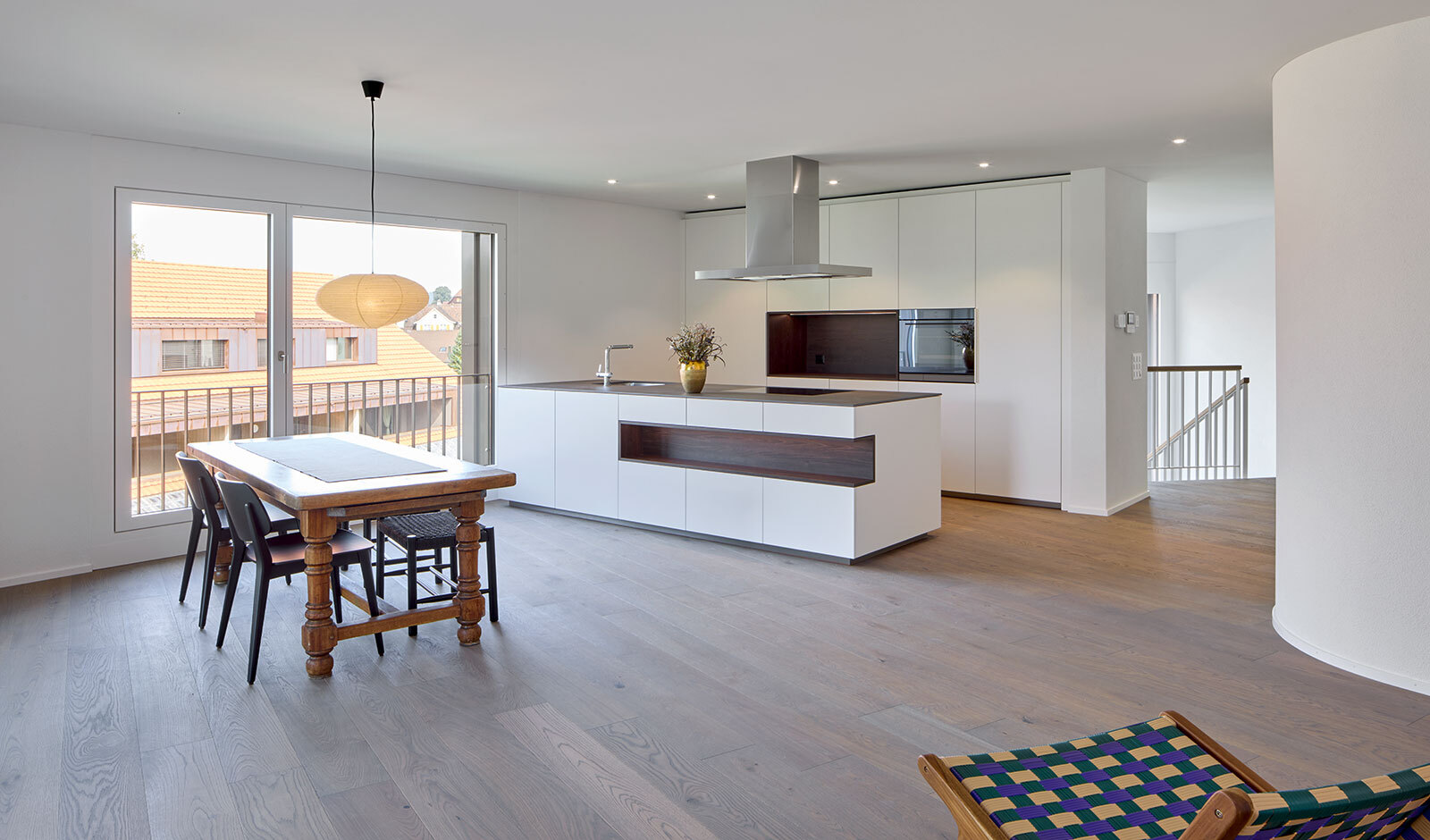 Die Wohnung befindet sich in einem architektonisch anspruchsvollen Neubau mit neuester Haustechnik und laufenden Garantien. Sie ist vollständig rollstuhlgängig und hochwertig ausgestattet – ganz so, wie man es vom renommierten Architekturbüro Romano & Christen kennt. Die erstklassige Küche mit Geräten von V-ZUG und einer markanten Kochinsel lädt zum Kochen und Geniessen ein. Ein praktisches Reduit direkt hinter der Küche bietet zusätzlichen Stauraum und sorgt für ein aufgeräumtes Ambiente. Das grosszügige Badezimmer sowie ein separater Hauswirtschaftsraum mit eigener Waschmaschine und Tumbler schaffen maximalen Komfort im Alltag.