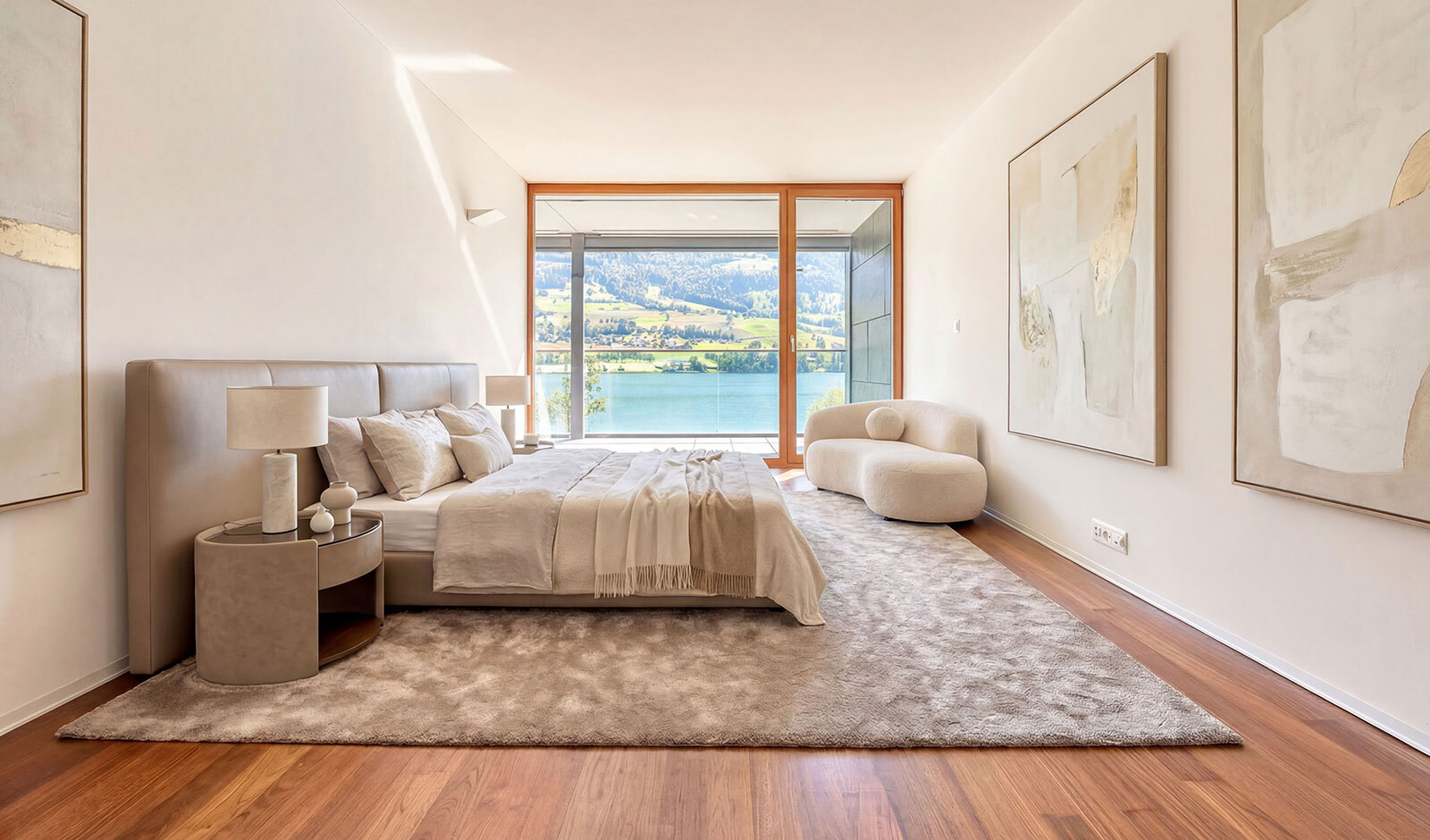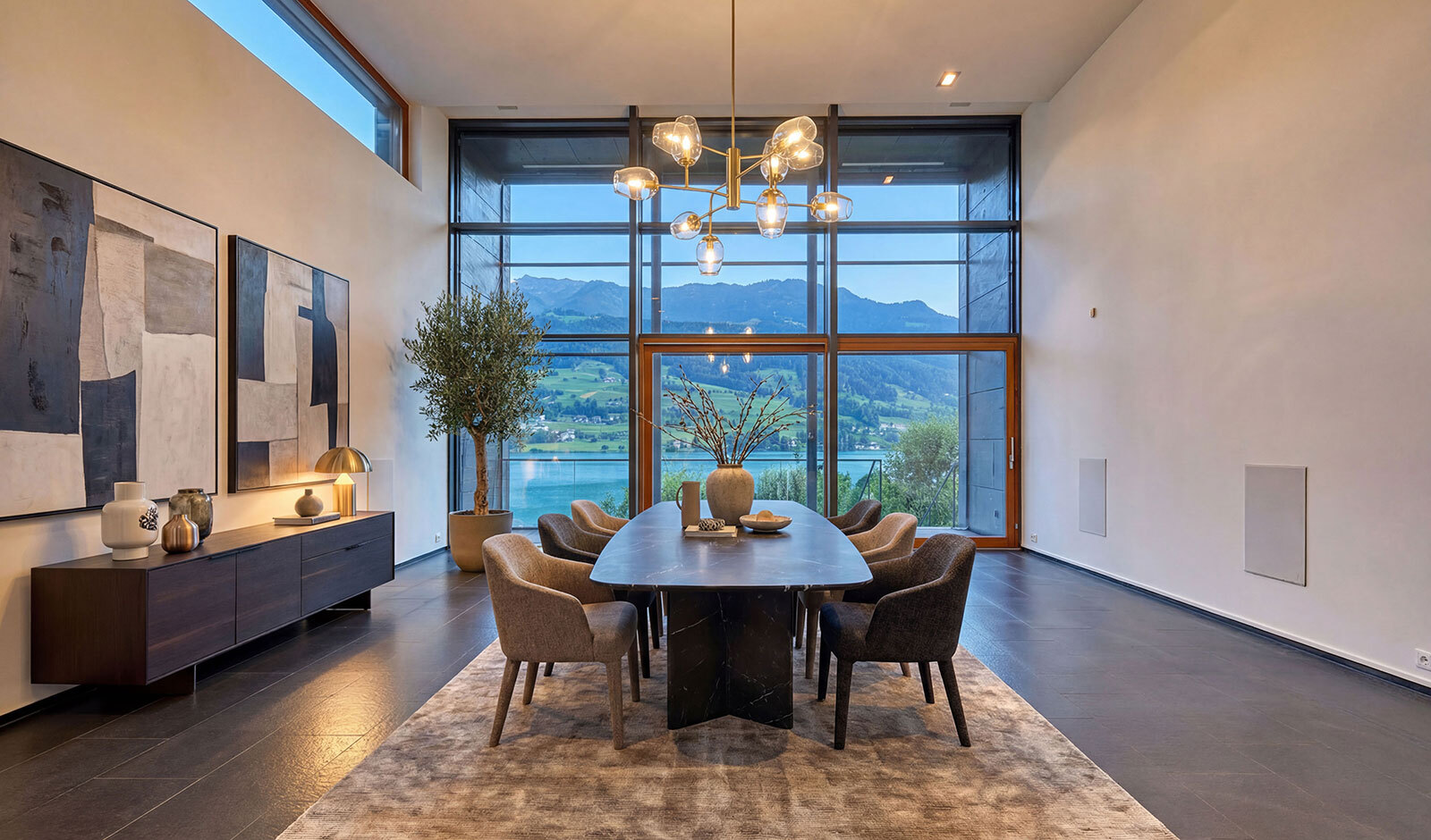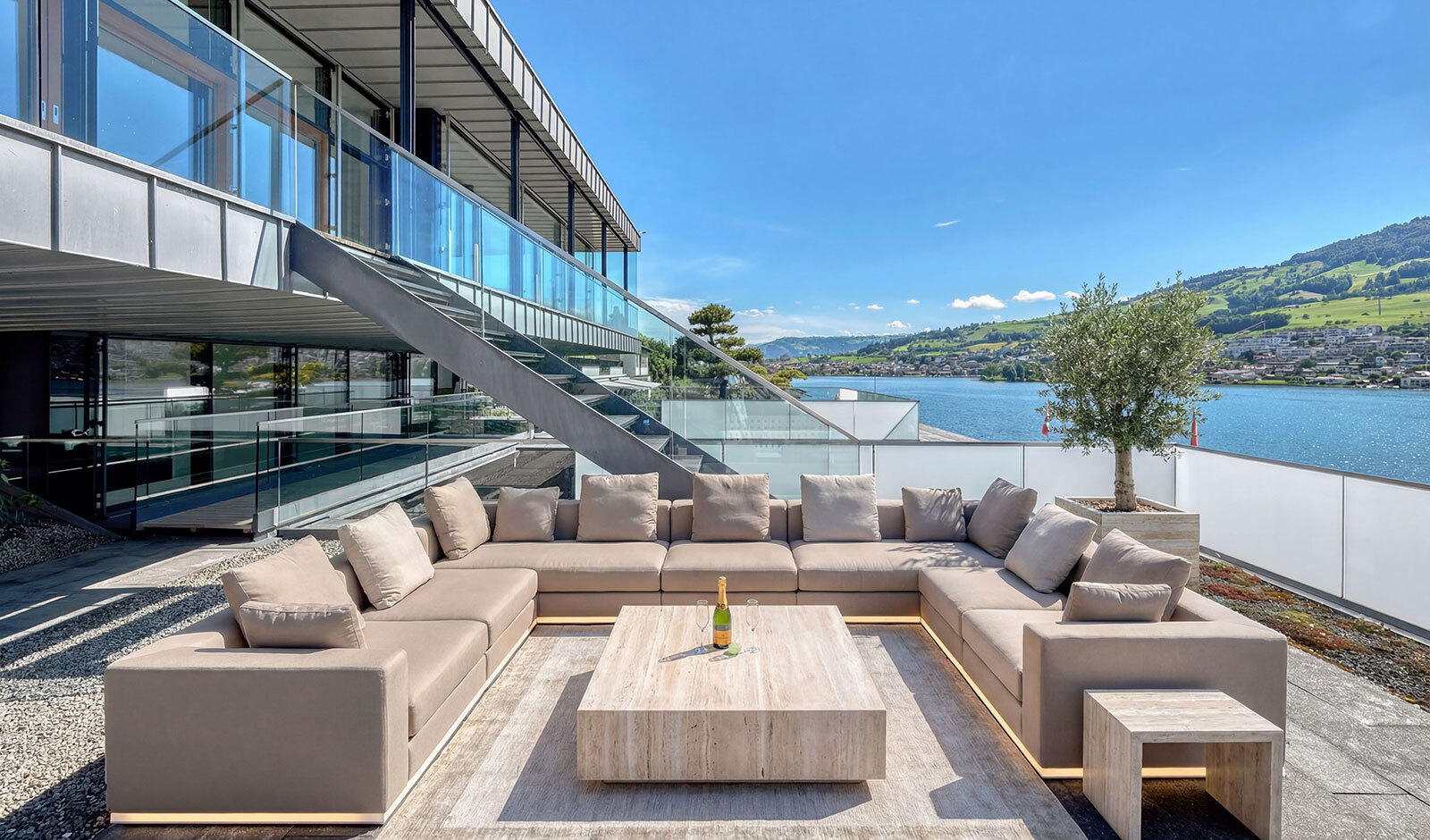 Der Spa-Bereich mit Sauna, Dampfbad und einem grossen beheizten Whirlpool lädt zur Entspannung ein. Dies ist gerade in den Wintermonaten ein Luxus, der jeden Tag zu etwas Besonderen macht. Im Sommer sorgt der Outdoorpool für erfrischende Momente mit maximaler Privatsphäre. Das Funkeln des Sees bringt dabei eine magische Lichtstimmung in sämtliche Räume – zu jeder Tages- und Jahreszeit.